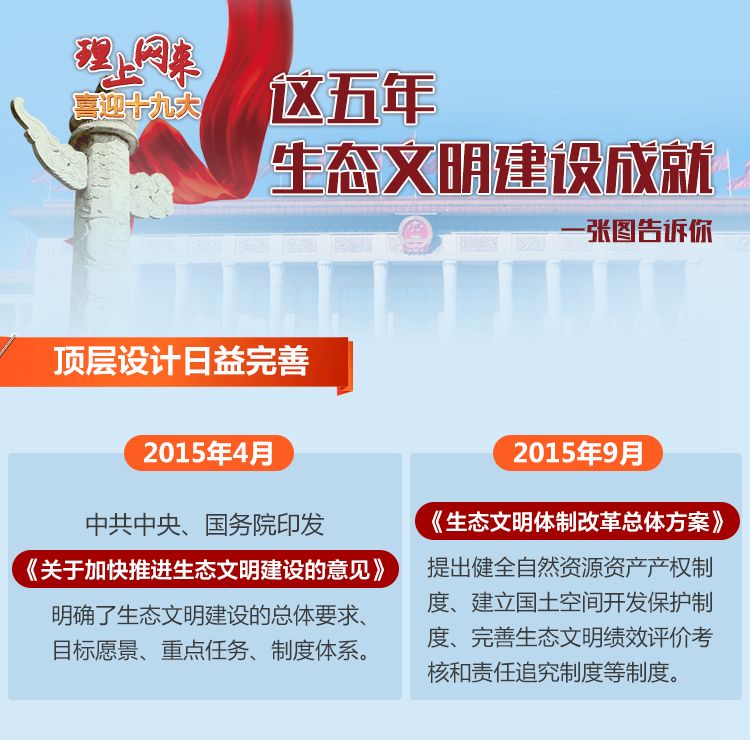 “绿水青山就是金山银山”。这五年来,随着绿色发展理念逐步融入中国人的生产生活,经济发展与生态改善已经实现良性互动,绿色中国新图景正在拉开帷幕。这五年,中国生态文明建设创造出哪些新成绩,下图将为你简略概述: